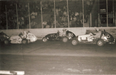| Jim, in his # 98, racing with three others. The car on the right was being driven by Ed "Dutch" Schaefer. | ![]() |